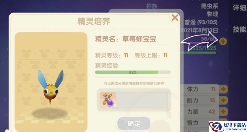 也可以使用道具增加精灵经验,点击经验条右边的+可使用道具。