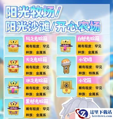 4、阳光牧场精灵:惊讶萝卜、地之鬼脸箱、火之鬼脸箱、风之鬼脸箱、水之鬼脸箱。