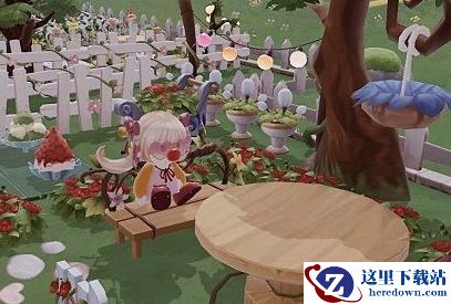 4、梦幻春天圆桌、长椅:商城-家具-梦幻春天系列。