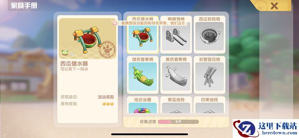 注意事项:虽然西瓜储水器的描述是“可以装下一吨水”,但是它并没有装水的作用,是用来装饰的,可以增加家园繁荣度。