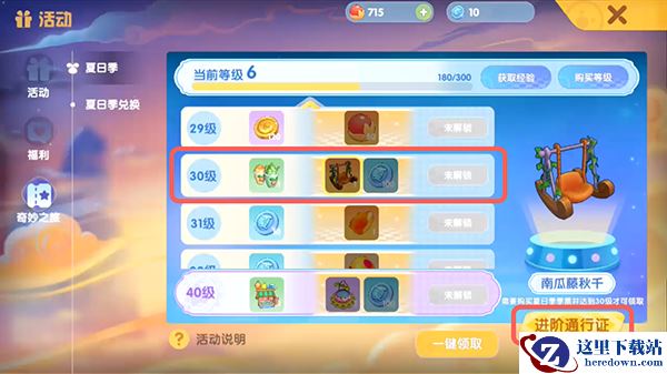 3.通过【夏日季】活动点击右下角【进阶通行证】花费30元购买季票,当等级达到30级时可领取获得;