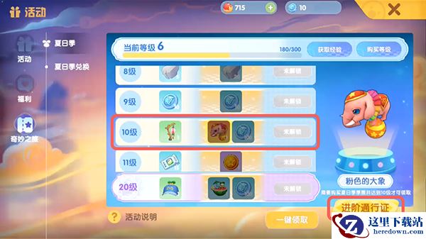 3、在【夏日季】中,点击右下角的【进阶通行证】,花费30元购买季票,当等级达到10级时可领取;