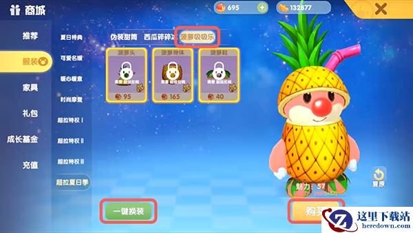 3.然后在上方切换到【菠萝吸吸乐】,点击一键换装,点击【购买】花费金豆购买即可获得。