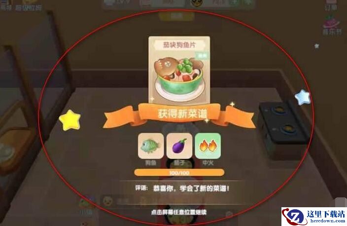 6、点选“中”设置中火,点击“开始”,获得并解锁茄块狗鱼片菜谱,点击屏幕任意位置即可。