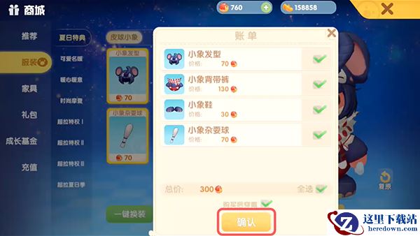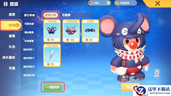 2、在左侧类型中切换到【服装】,在【夏日特典】中找到皮球小象套装,点击【一键换装】;