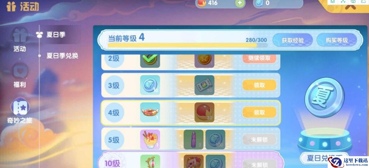 冰淇淋的菜谱很容易获得,小摩尔们打开【活动】-【奇妙之旅】-【夏日季】,等级达到5级后,就可以领取七彩草莓冰淇淋菜谱了呢!