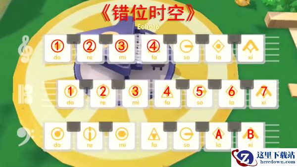 《错位时空》主要是弹奏中间的琴键,为了方便区分琴键,将第一行的琴键设置为①到⑦数字,第三行琴键的6和7设置为A、B,可根据上图对照。