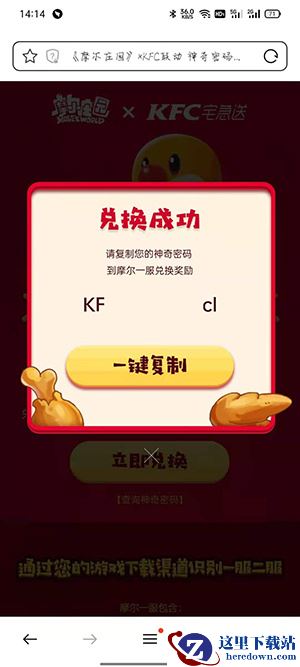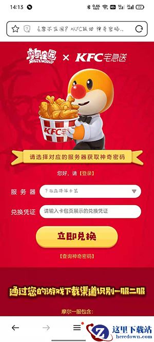 打开肯德基APP,点击【我的】;登录账户点击【卡包】;点击【券】,找到摩尔庄园兑换凭证;点击复制代码,再点击【去使用】;登录游戏账号,选择服务器,输入兑换凭证;这样兑换码就转换为神奇密码了,再点击【一键复制】;登录摩尔庄园,点击【活动】按钮;点击福利,输入神奇密码就可以拿到肯德基家具了。