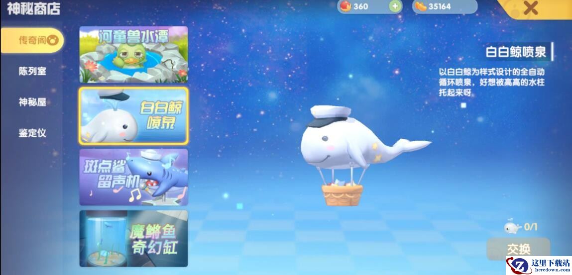 2、兑换物品:5星鱼,如白白鲸、斑点鲨、河童等,可以去大力商人那兑换家园家具