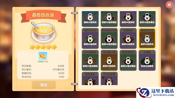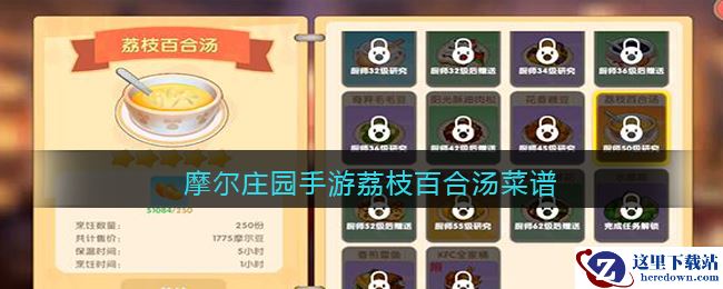 游戏中荔枝百合汤制作需要的材料包含:荔枝2个、百合花2个、小麦3个。做好了记得跟居民分享,或者卖给花婶!荔枝百合汤是是一道品质达到了5星级的料理,需要在SMC等级达到50时才能制作和解锁,其餐厅售价是234摩尔豆。