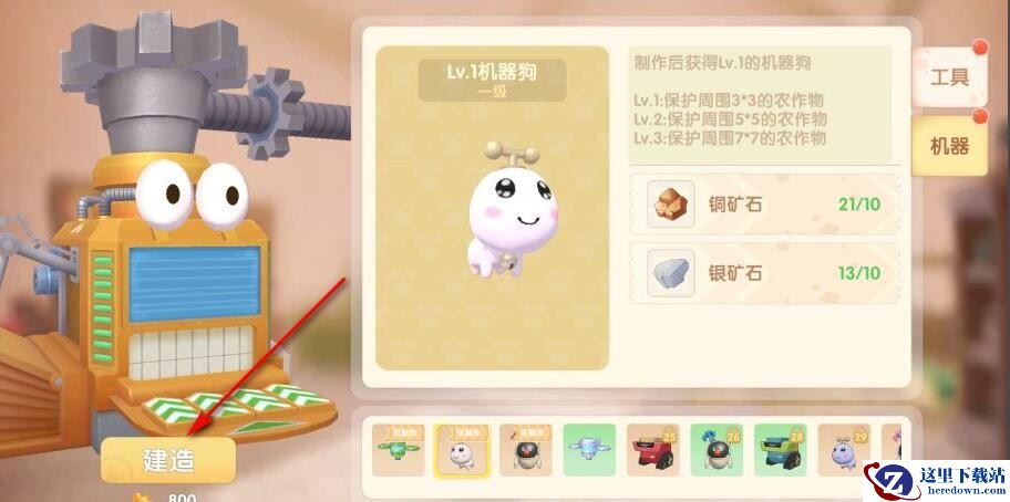 5、选中机器狗后再点击页面左侧的【建造】功能,这时消耗铜矿石×10、银矿石×10就能成功制造出机器狗了。