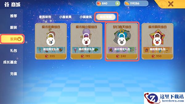 3、然后在【家具】栏切换到【超拉专属】,点击梦幻春天组合进入;