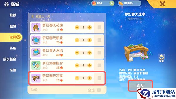 4、找到梦幻春天凉亭,点击【购买】花费25金豆购买即可。