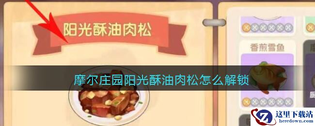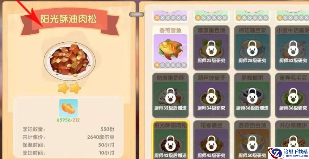 游戏中厨师等级达到42级赠送阳光酥油肉松,大家可以选择用鸡蛋*2+胡萝卜*2+猪肉*3(中火)制作阳光酥油肉松,也可以直接花费摩尔豆制作。