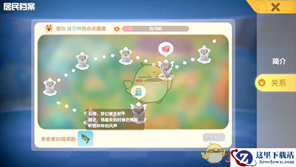 提高和丝尔特的好感度达到25级时,可以通过脚印中的居民档案领取梦幻春天秋千,也就是大家所想要的树叶秋千。