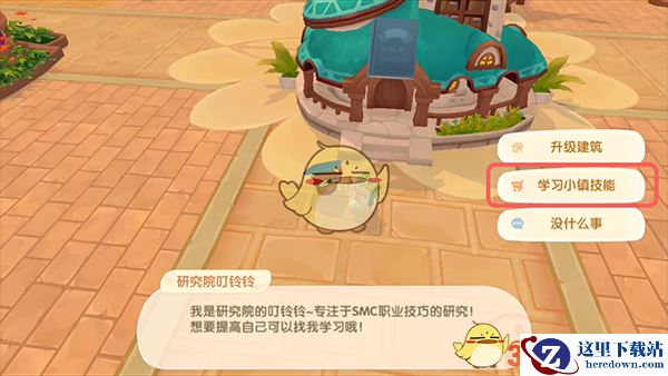 3.在小镇中心建筑中找到【研究院叮铃铃】,靠近后对话选择【学习小镇技能】;