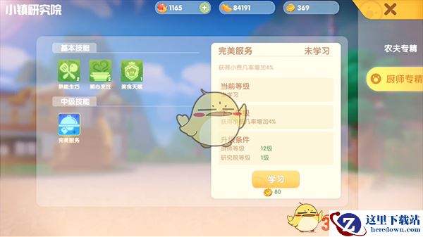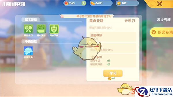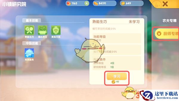 解锁并加入小镇后可学习该技能,找到“研究院叮铃铃”选择“厨师专精”可学习;