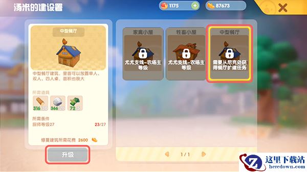 3、点击【中型餐厅】,然后点击左下角的【升级】即可。