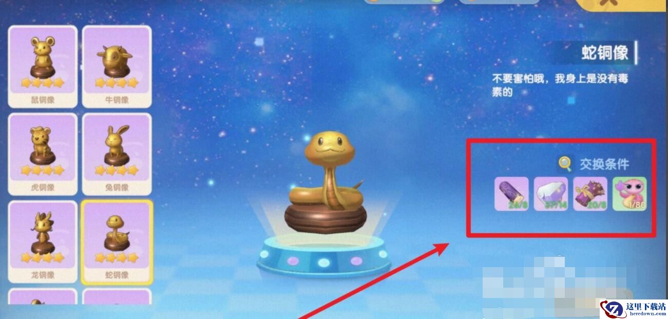 3、陈列室中“蛇铜像”的兑换材料需要樱花蛇。材料齐全就可以兑换这个家具了!