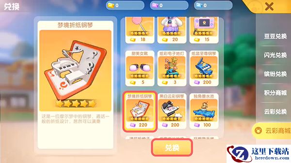 找到【梦境折纸钢琴】后,消费220云彩紫券单击【兑换】可获得。