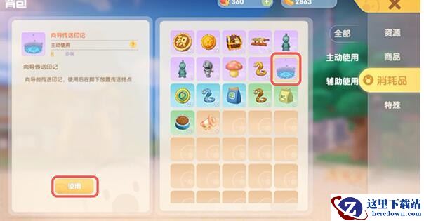 2、来到需要放置印记的位置,打开背包在消耗品中找到【传送印记】,点击左侧的【使用】;