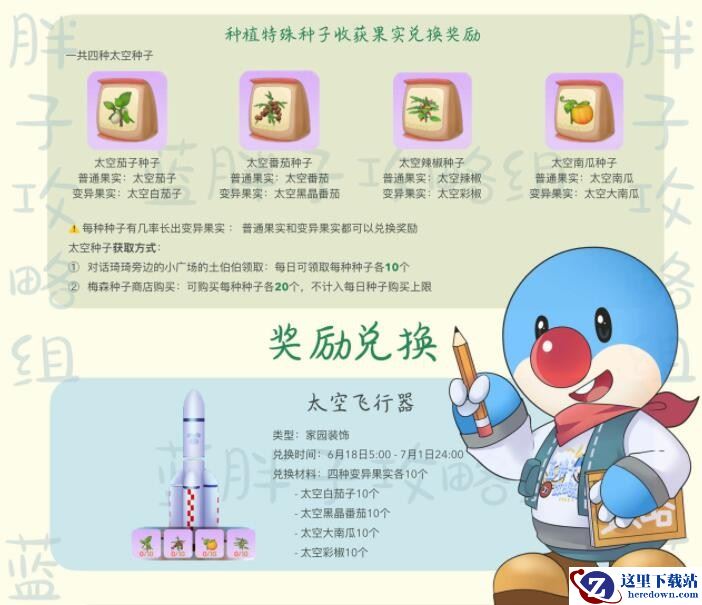 太空种子可以种出普通太空果实,有几率长出变异太空果实,普通和变异太空果实均可兑换奖励