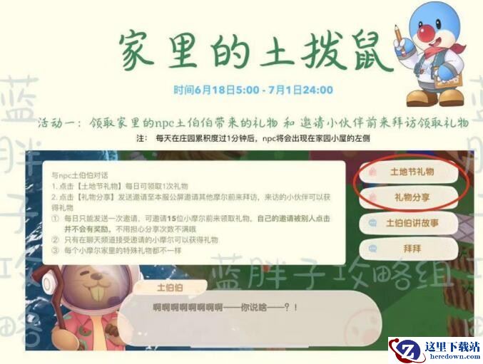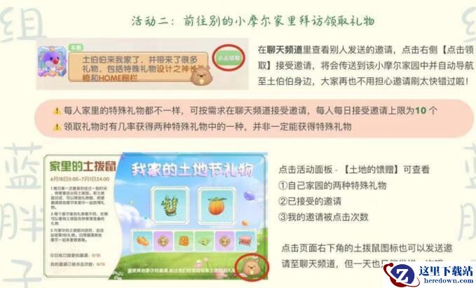 在【家里的土拨鼠】活动中,发送邀请至聊天频道邀请别的小摩尔来领取礼物,也可以接受聊天频道邀请前往别的小摩尔家园领取礼物,每天只能发送一次邀请。每天只能接受10次邀请。