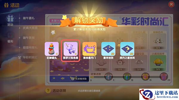紫罗兰独角兽是华彩时尚汇活动最终奖励之一,在活动6月1日到7月1日这一个月的时间内,按照活动的要求集齐指定服装其中20套,就可以领取到最终奖励,其中就包括紫罗兰独角兽,一共可获得四个紫罗兰独角兽。