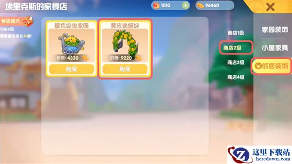 3.在右侧选择“邻居装饰”,切换到“商店2级”,点击“黄玫瑰盛绽”;