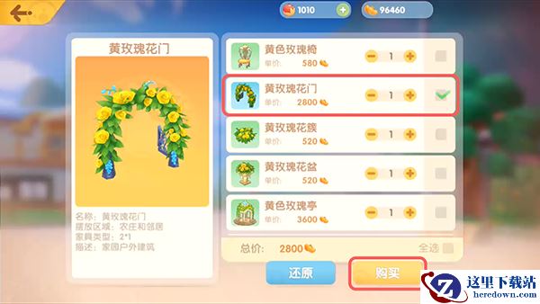 4.找到需要购买的“黄玫瑰花门”,勾选后点击“购买”即可获得。