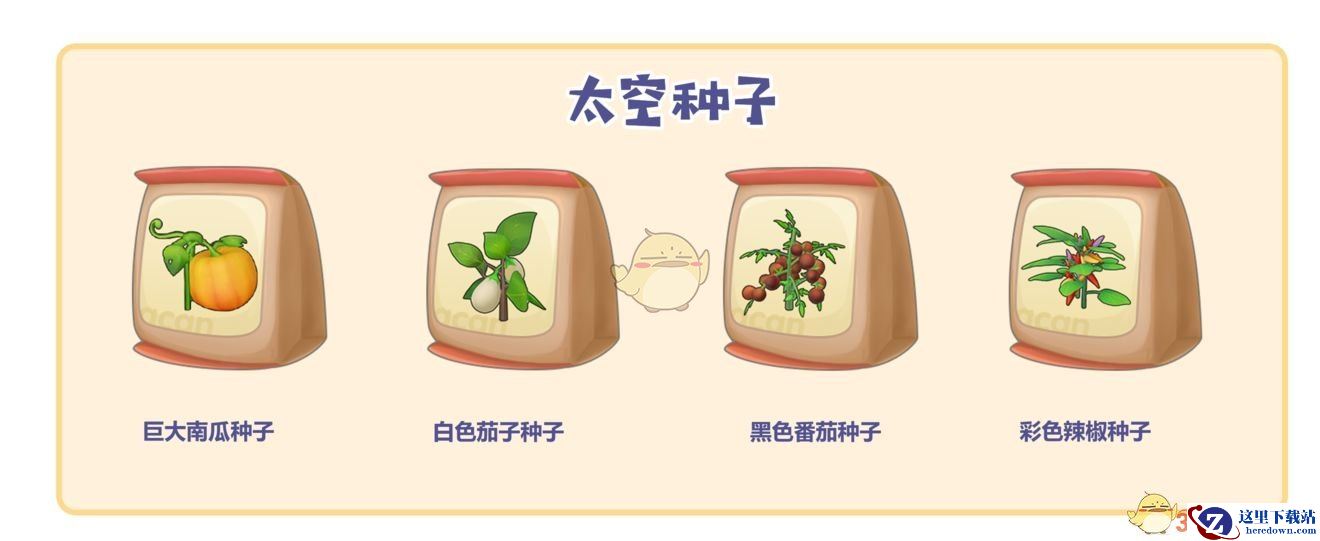 土伯伯给小摩尔带来了来自太空的变异种子,分别是太空茄子种子、太空番茄种子、太空南瓜种子和太空彩椒种子。