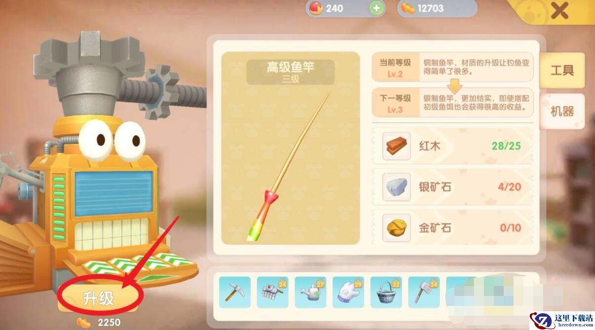 进入游戏,点击右上方【店铺】,在店铺界面可以找到并点击【R7机器制作店】,在此选择鱼竿,就可以进行升级了。鱼竿升级是需要消耗一定的材料,材料收集齐全之后就可以点击【升级】按钮来进行升级,同时鱼竿升级也是需要花费一定的摩尔豆。