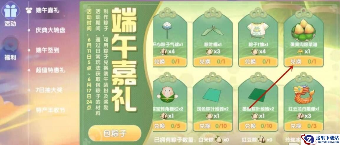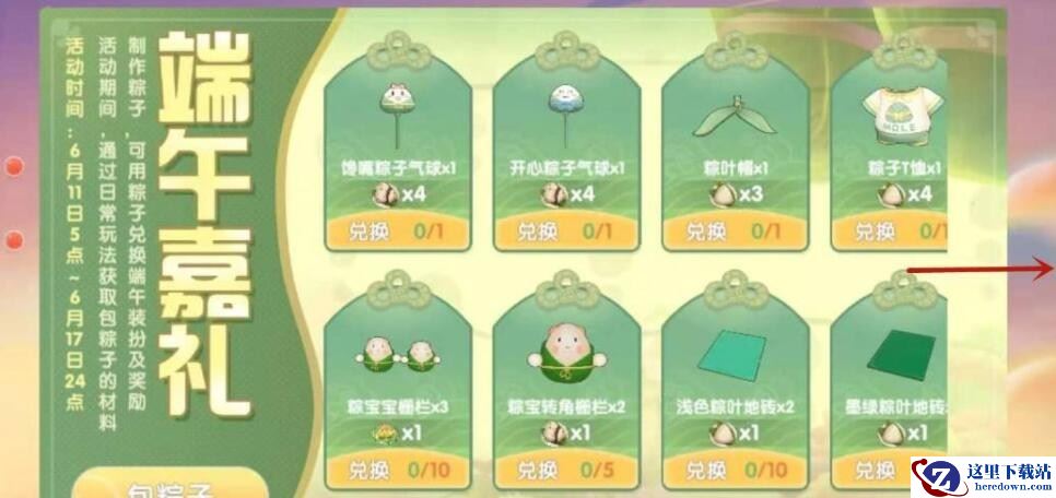游戏中大家可以在6月11-17日用粽子兑换开心粽子气球、粽叶包、粽子T恤、蛋黄肉粽菜谱、粽宝转角栅栏、浅色粽叶地砖、墨绿粽叶地砖、红云龙舟雕像等奖励。