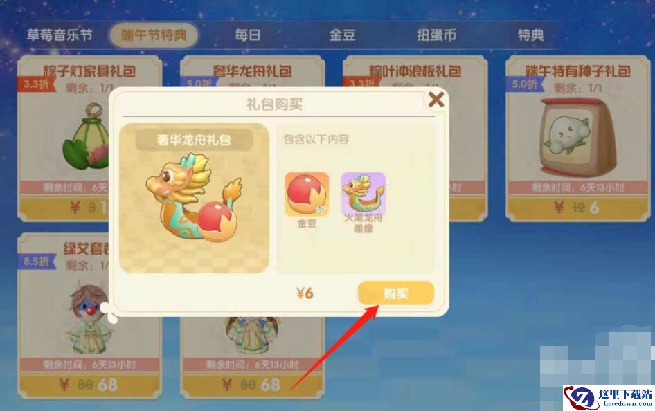 4、选择【奢华龙舟】礼包,点击购买即可获取火尾龙舟雕像及60金豆。