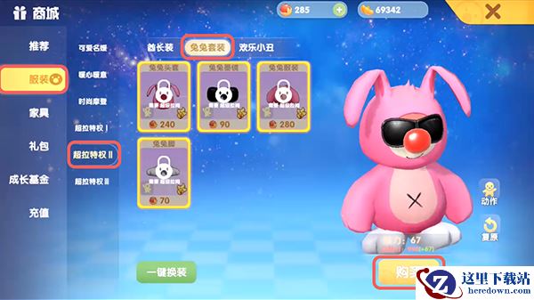 3、切换到【服装】-【超拉特权II】-【图图套装】,点击【一键换装】,购买兔兔套装所有的服装即可。