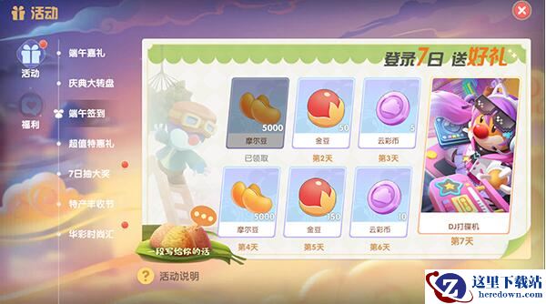 2021年6月11日5:00--6月17日24:00期间,参与七日签到活动,在签到奖励中就包含DJ打碟机(含动作),另外还可以拿到扭蛋币*15、金豆*200、摩尔豆*10000,大家不要断签,最好奖励都能拿到!