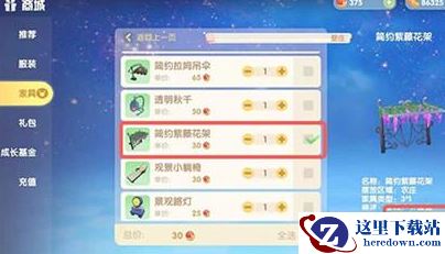 ③在家具列表中,上下滑动找到【简约紫藤花架】,勾选、选择需要购买的数量,点击右侧的【购买】;