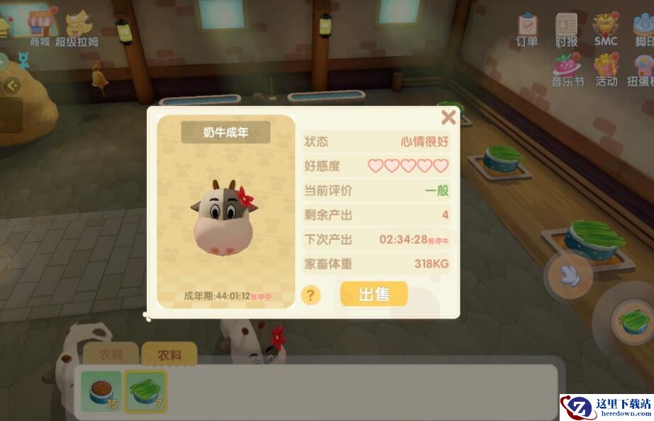 游戏中奶牛暂停生产主要是奶牛好感度不够了,这时需要给奶牛提升好感度才会再次生产,方法是:在右上角店铺-牧场里面买梳子,然后用刷子给奶牛刷刷就行,当奶牛产出为0就可以卖了。