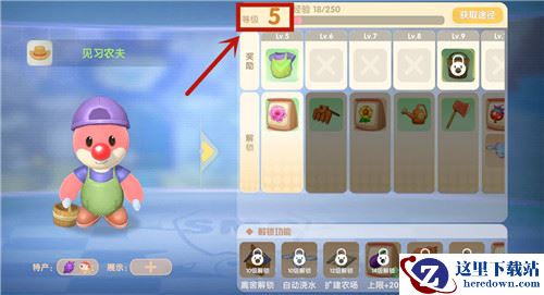 最后就能来到农场主界面,最上面显示的就是自己当前的农夫等级,并且详细显示了还差多少经验升到下一级。奖励内容和解锁的功能,可以向左滑动奖励列表查看,等级对应解锁的功能也是这样。