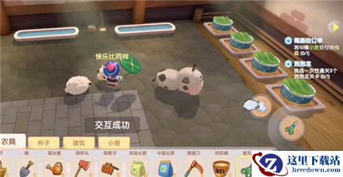 养殖绵羊后,来到牧棚,靠近一只绵羊,选中农具【剃毛刀】,按下右下角的剪刀按钮。