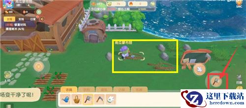 3、最后靠近树木,如下图所示,黄色方框标记的就是树枝,靠近树枝然后点击右边斧头即可清理。