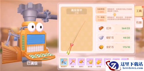 最后便能来到工具升级界面,比如你想要给高级鱼竿升级,就需要准备25个红木+20个银矿石+10个金矿石。