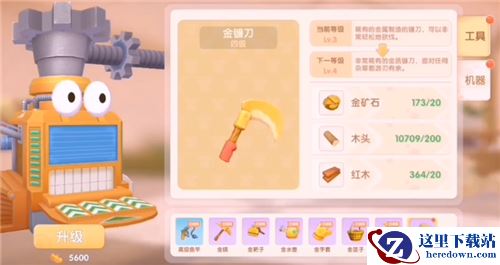 给金镰刀从3级升到4级,就需要20个金矿石+200根木头+20根红木,并且耗费5600个摩尔豆。这个机器每次给农具升级的时候,都会播放一段特写动画,等待片刻升级完成。
