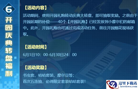 活动期间,使用开园礼炮转动庆典大转盘,即可抽取奖励。之前由于开园延期的补偿——40个【开园礼炮】已经发放到小摩尔们的邮箱中。此外,开园礼炮也可通过完成活动任务、前往开园烟花现场获取。