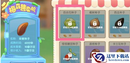 百合花种子要在“梅森商店/售卖机”中购买,如图所示,必须将农场主等级升到【34级】才能以19摩尔豆一颗种子的价格购入。虽然不贵,但等级要求比较高。