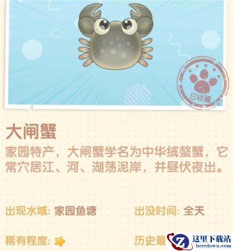 1、游戏中大闸蟹会出现在家园鱼塘中,但是注意这是家园特产动物。