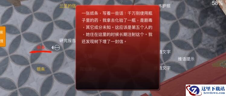一张纸条,位置如图,内容:千万别使用瓶子里的药,我拿去化验了一瓶,是剧毒,其它成分未知。这应该是第五个人的,她住在这里的时候长期注射这个。我还发现树下埋了一封信.