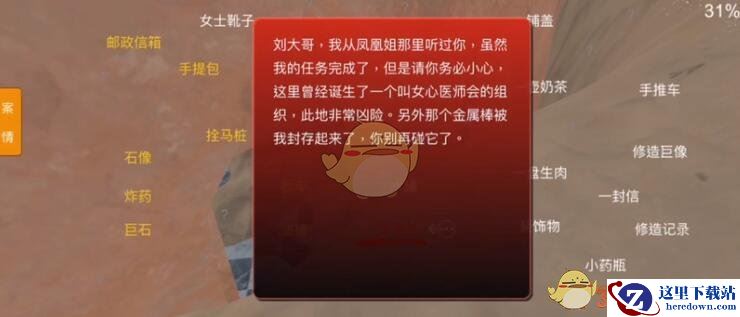 刘大哥,我从风凰姐那里听过你,虽然我的任务完成了,但是请你务必小心,这里曾经诞生了一个叫女心医师会的组织,此地非常凶险,另外那个金属棒被我封存起来了,你别再碰它了.