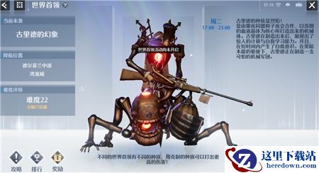 周二的首领为古里德的幻象,刷新位置为德尔菲兰中部湾流城附近,种族为烈焰,用怒涛种族的幻灵可造成额外伤害。