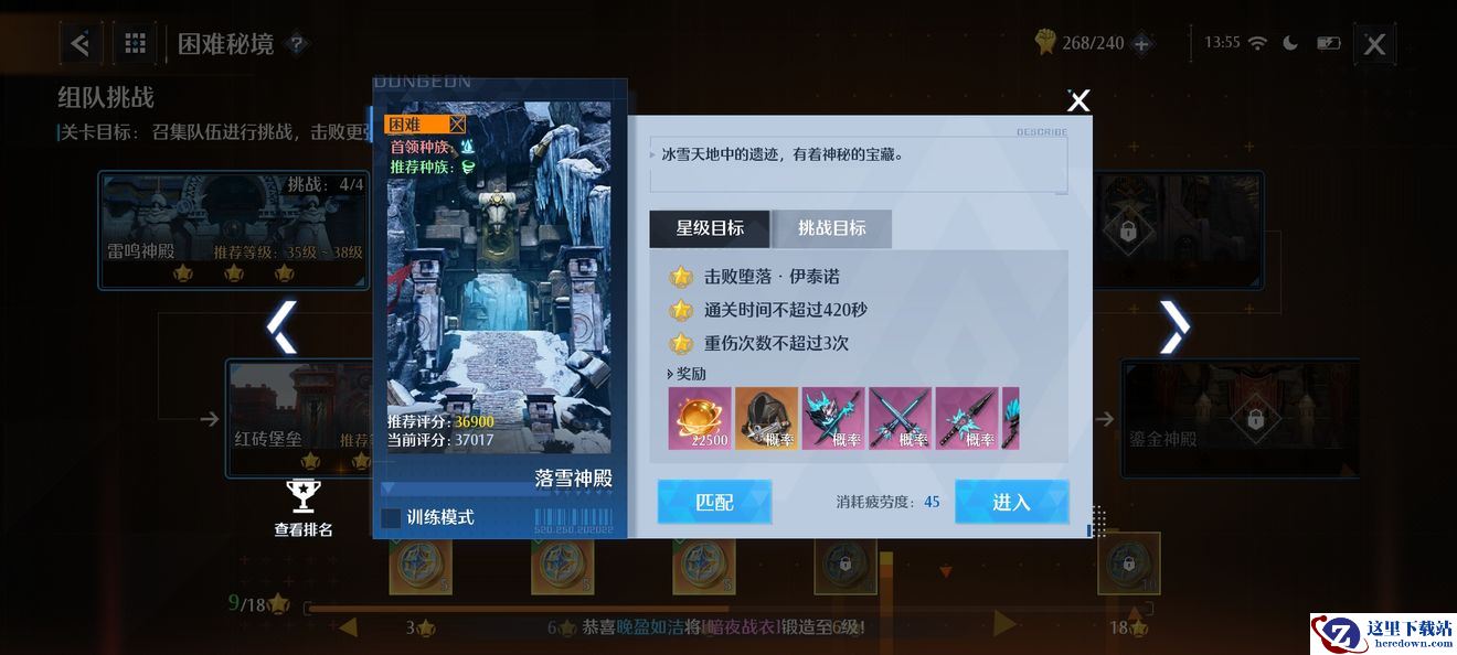 每达成一个基础星级目标,则会在困难秘境-组队挑战的下方累积星级数的进度条中加1星,【落雪神殿】是第三个困难秘境,完成全部基础星级目标后可以达到9星,可以领取5幸运硬币的奖励,这也是幸运硬币的重要来源之一。